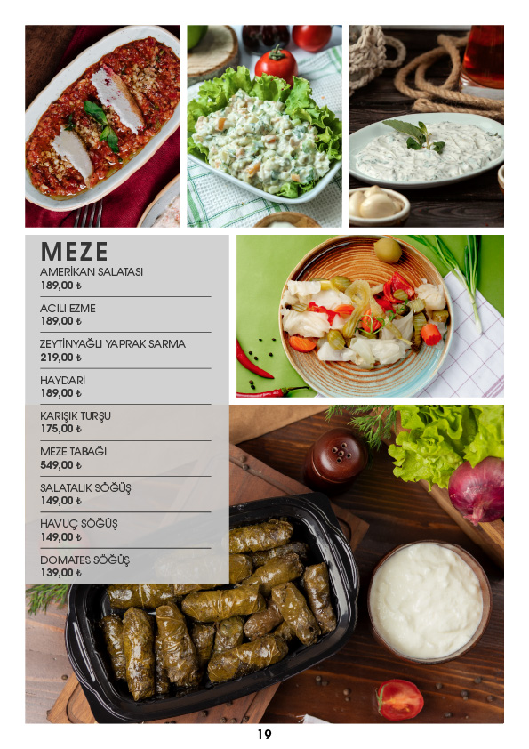 MEZE AMERİKAN SALATASI 75,00 ACLI EZME 75,00 ZEYTİNYAĞLI YAPRAK SARMA 79,00 HAYDARİ 75,00 KARIŞIK TURŞU 70,00 MEZE TABAĞI 199,00 SALATALIK SÖĞÜŞ 65,00 HAVUÇ SÖĞÜŞ 65,00 DOMATES SÖĞÜŞ 65,00 19