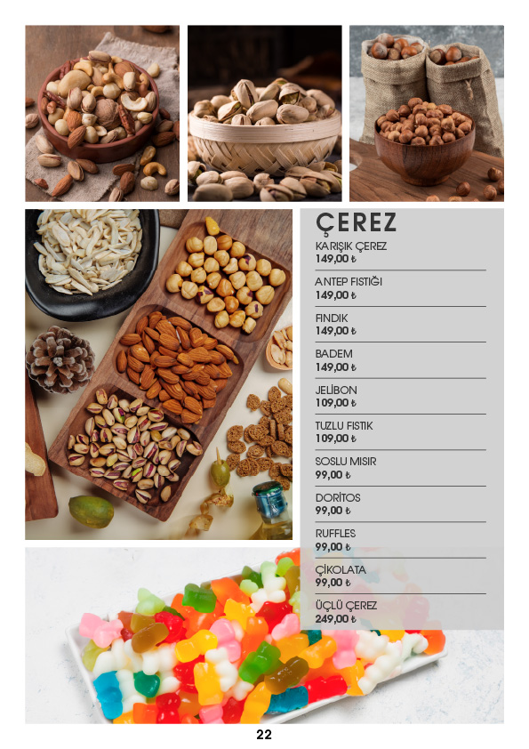ÇEREZ KARIŞIK ÇEREZ 59,00 ANTEP FISTIĞI 79,00 FINDIK 69,00 BADEM 85,00 JELİBON 49,00 TUZLU FISTIK 49,00 SOSLU MISIR 35,00 DORİTOS 49,00 RUFFLES 49,00 ÇİKOLATA 49,00 ÜÇLÜ ÇEREZ 120,00 22