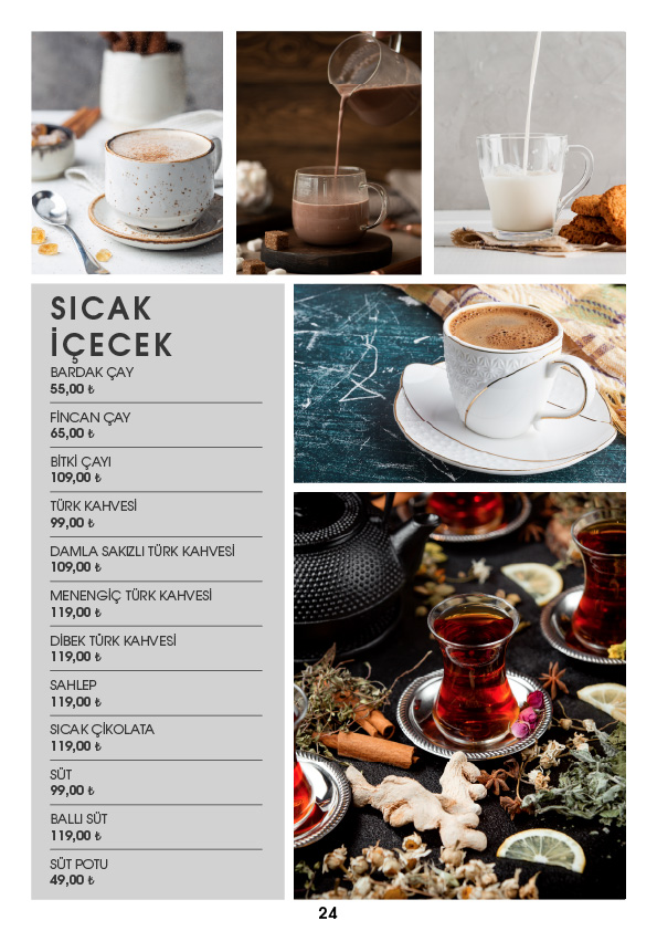 SICAK İÇECEK BARDAK ÇAY 20,00 FİNCAN ÇAY 25,00 BİTKİ ÇAYI 55,00 TÜRK KAHVESİ 35,00 DAMLA SAKIZLI TÜRK KAHVESİ 45,00 MENENGİÇ TÜRK KAHVESİ 50,00 DİBEK TÜRK KAHVESİ 45,00 SAHLEP 50,00 SICAK ÇİKOLATA 50,00 SÜT 35,00 BALLI SÜT 45,00 SÜT POTU 11,00 24