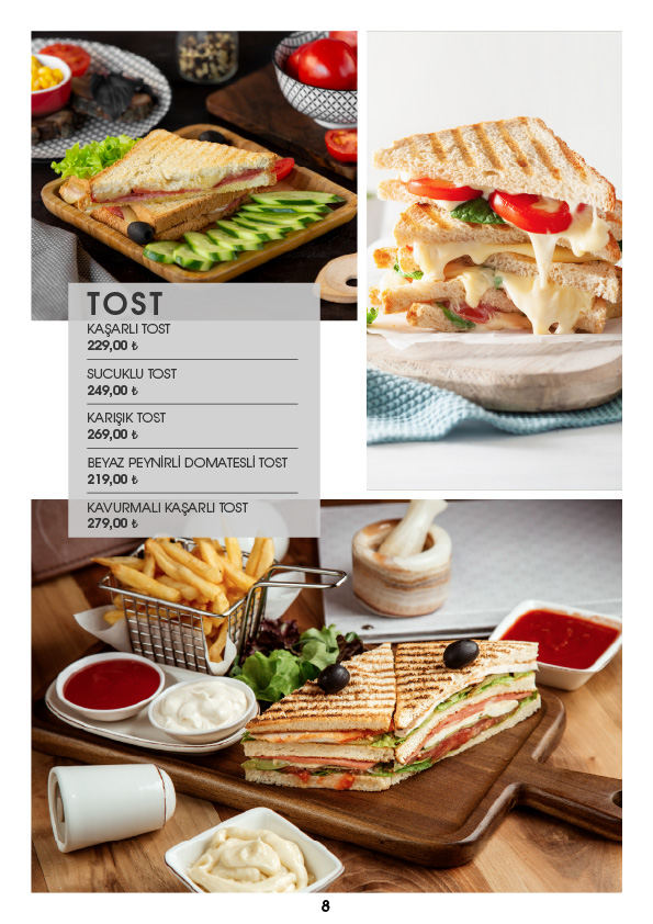 TOST KAŞARLI TOST 75,00 SUCUKLU TOST 85,00 KARIŞIK TOST 90,00 BEYAZ PEYNİRLİ DOMATESLİ TOST 80,00 KAVURMALI KAŞARLI TOST 99,00 8